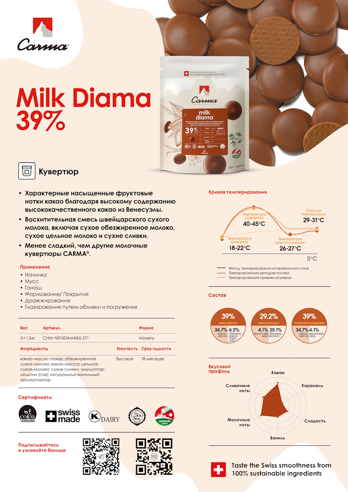 Главная » Все для кондитера » Шоколад и какао продукты » Шоколад молочный » Молочный шоколадный кувертюр MILK DIAMA 39%, Carma, 1,5кг