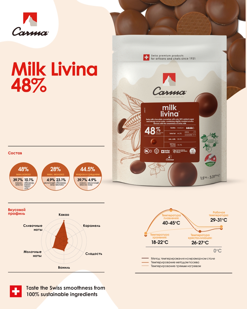 Молочный шоколадный кувертюр LIVINA 48%, Carma, 1,5кг « Шоколад молочный