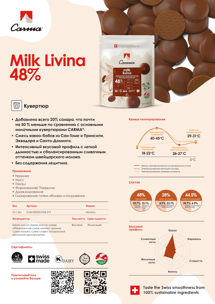Молочный шоколадный кувертюр LIVINA 48%, Carma, 100г « Шоколад молочный