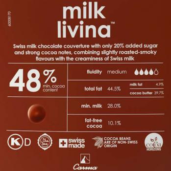 Главная » Все для кондитера » Шоколад и какао продукты » Шоколад молочный » Молочный шоколадный кувертюр LIVINA 48%, Carma, 100г