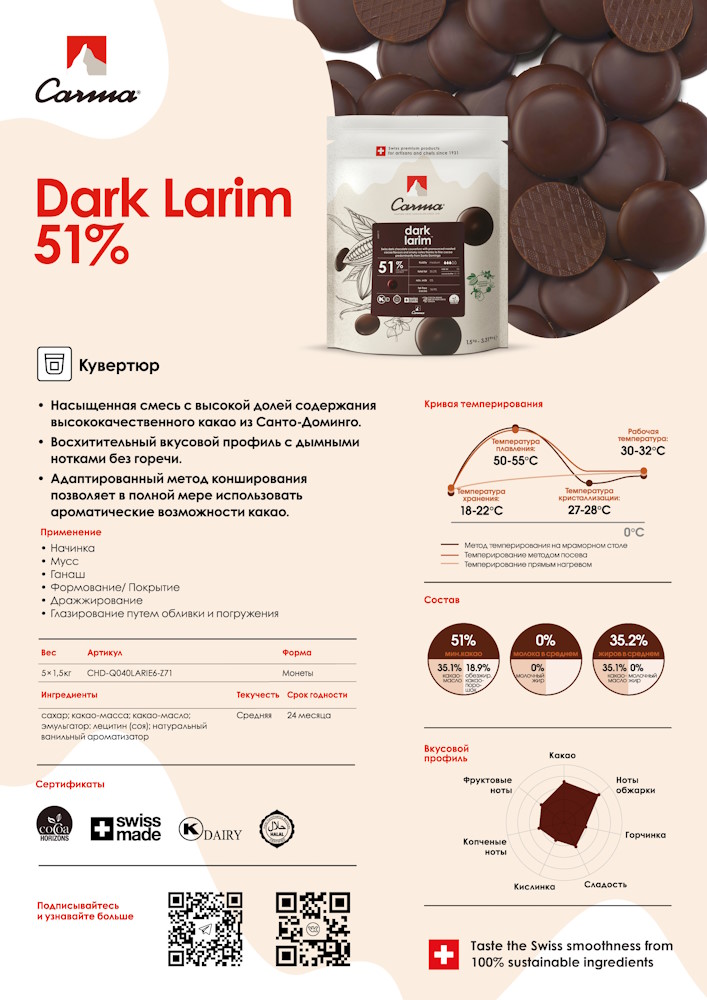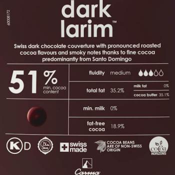 Carma ® Dark Larim 51% Насыщенная смесь с высокой долей содержания высококачественного какао из Санто-Доминго. Восхитительный вкусовой профиль с дымными нотками без горечи. Адаптированный метод конширования позволяет в полной мере использовать ароматические возможности какао.